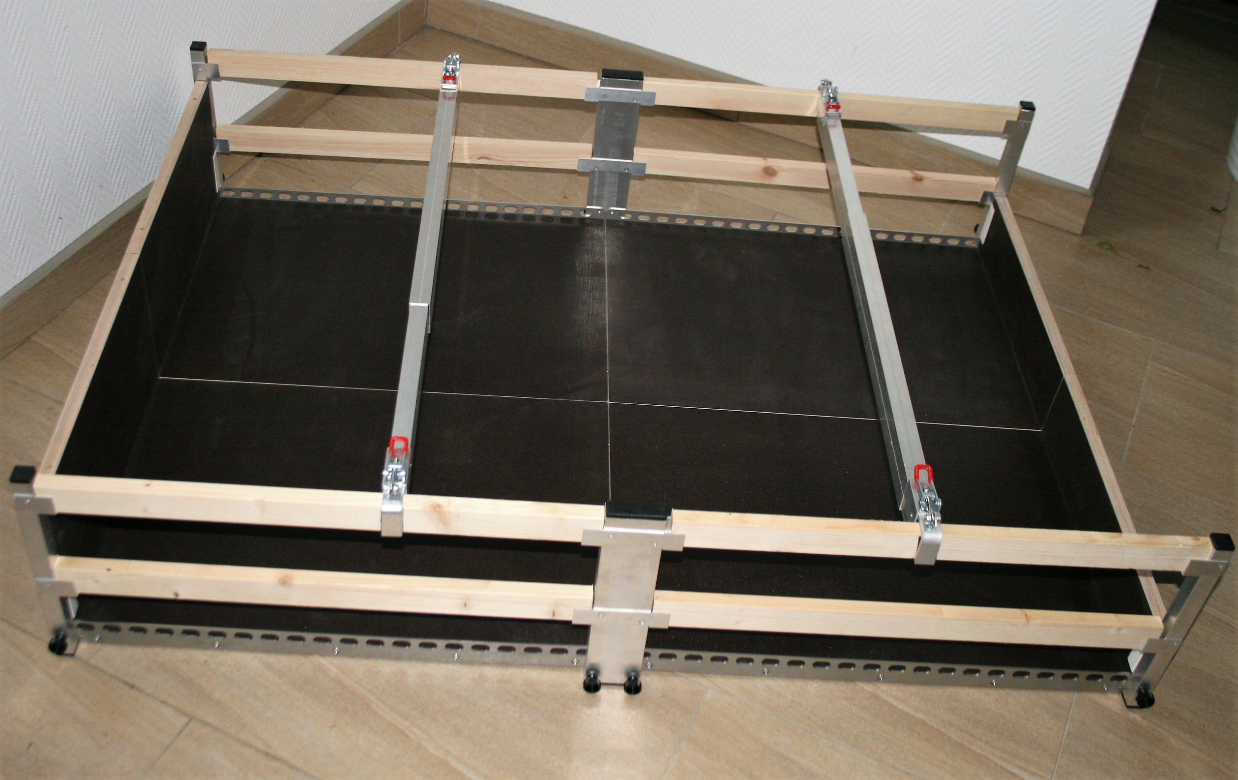 Sperrbalken inkl. vorderer mittlere und hintere Fahrzeug-Rungen aus Aluminium, sowie 8 Einsteckbretter aus Holz.